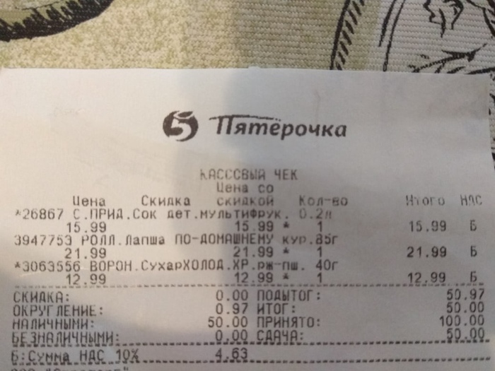По чеку видно что только 3 позиции были обложены налогом - значек "H" справа от цены.