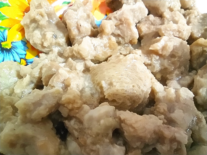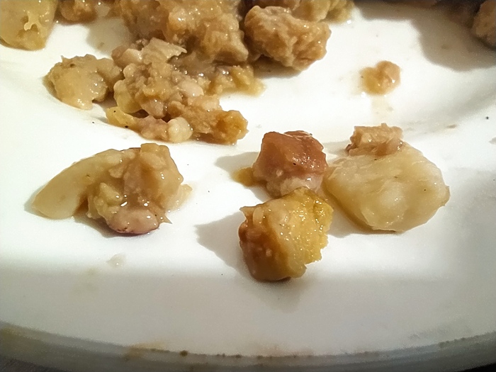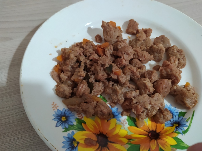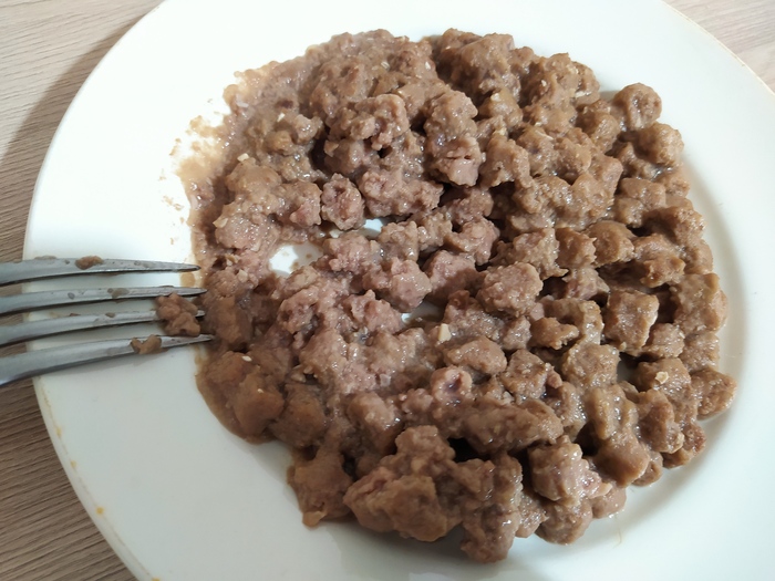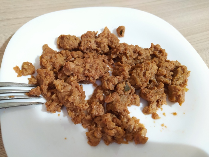 Пробую и расстраиваюсь. Очень сладко, очень мягко, очень всё нежное, с привкусом дешёвой псевдотушёнки за 20 рублей и очень-очень много жира. Этот вариант вызвал у меня отвращение больше даже чем первый вариант, самый горький.