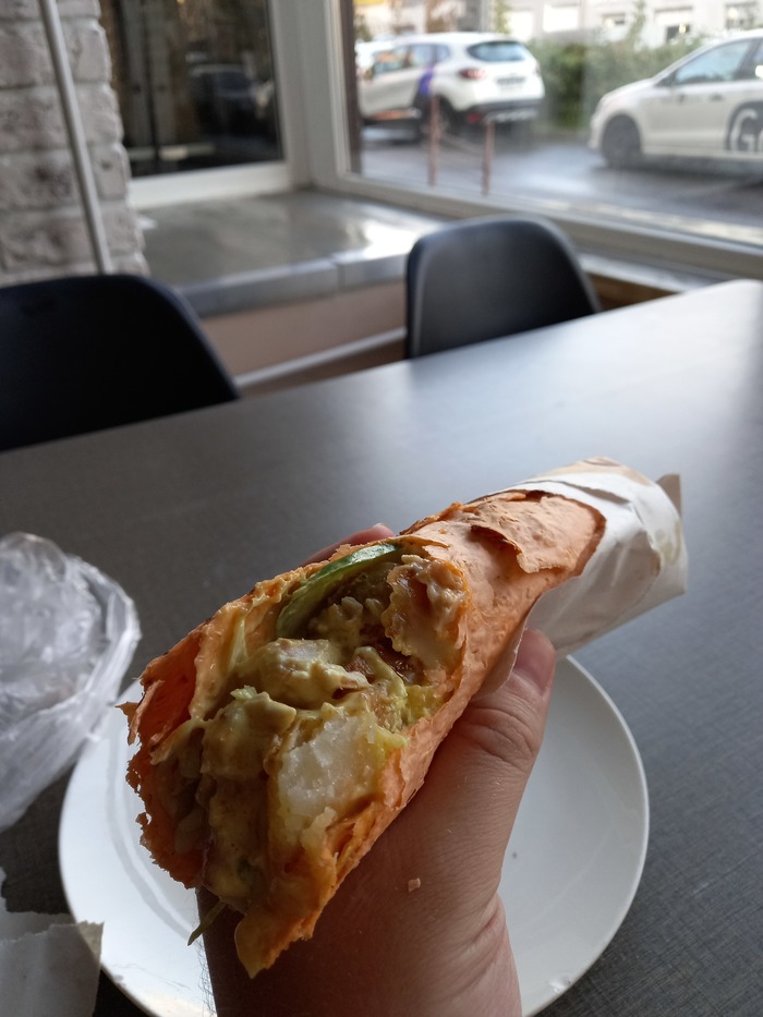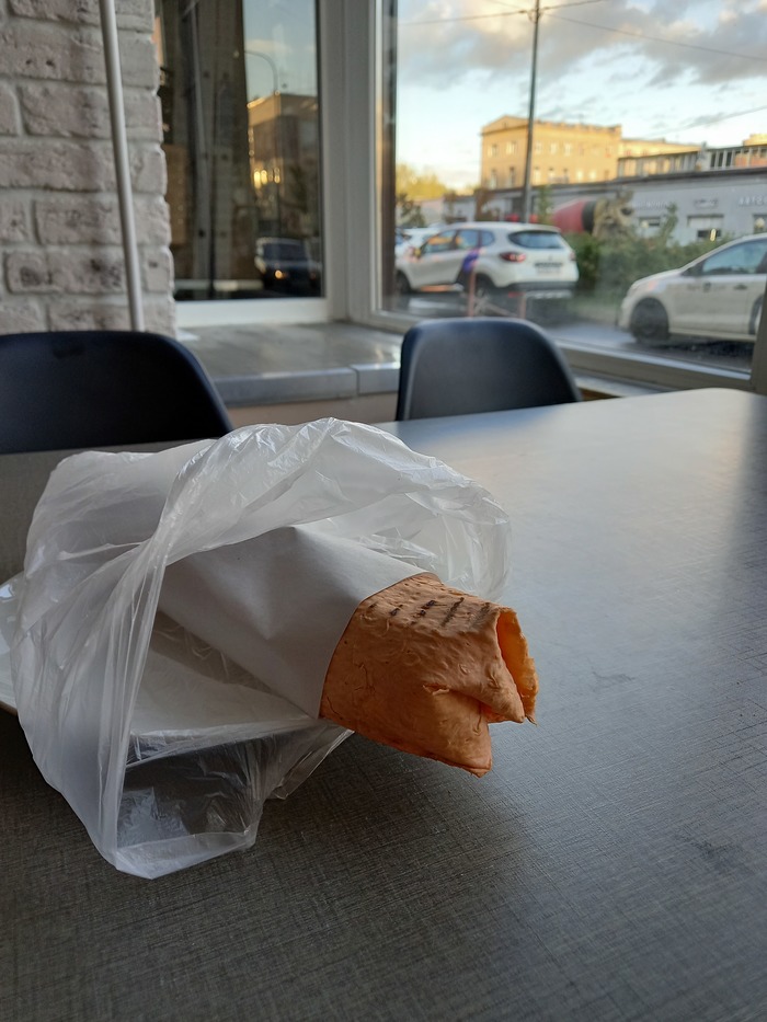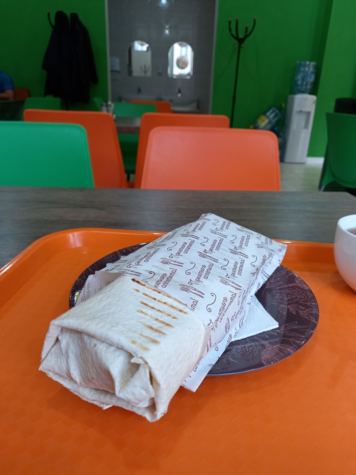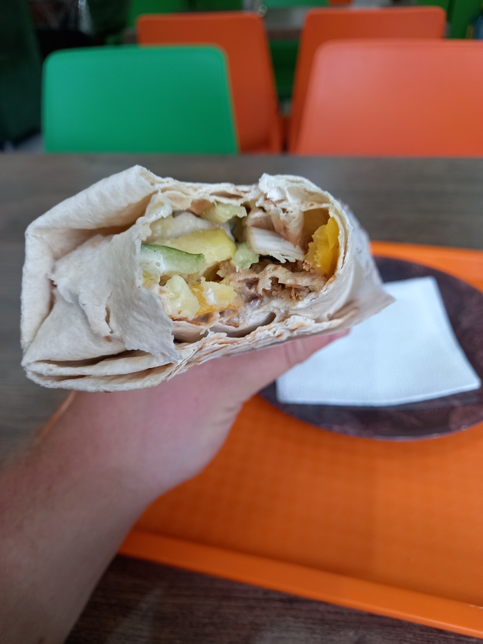 Хрустящий лаваш, очень вкусный, не размякший. Нужной температуры и сыр уже тает, но не обжигает. Острый перец, чувствуется слегка кинза, свежие овощи и лук, но не чеснок и соус не чесночный, хотя и жидковат и его много в конце. Не обляпался, но салфетки кончил все, такой вот каламбур.