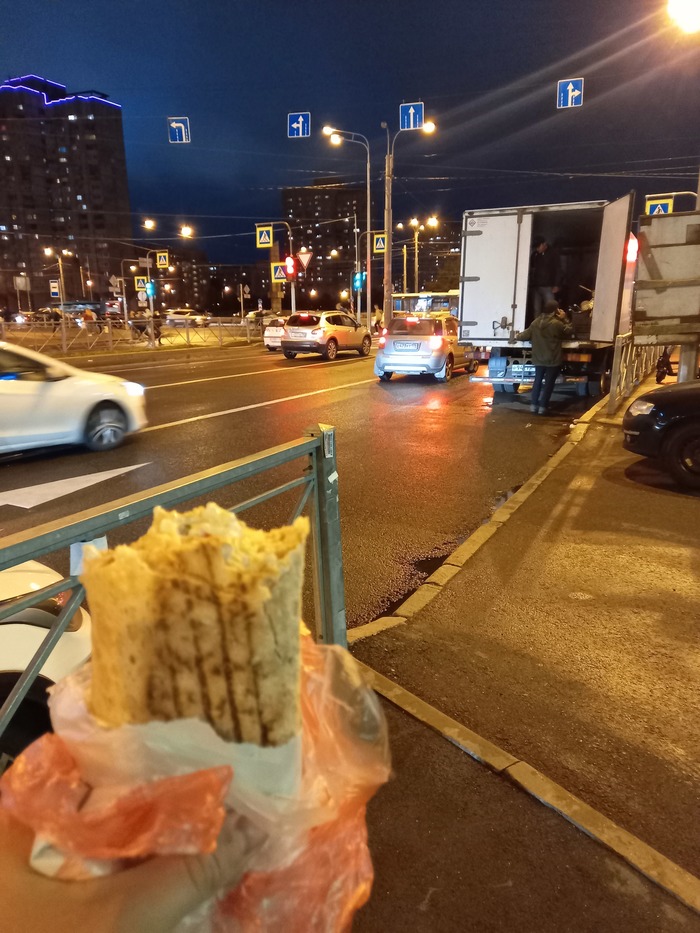 Шаверма большая, увесистая, тоже турецкая за 210р, но без сыра внутри и в непримечательного вида стандартном лаваше, как серый Питер осенью.