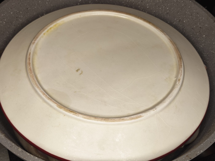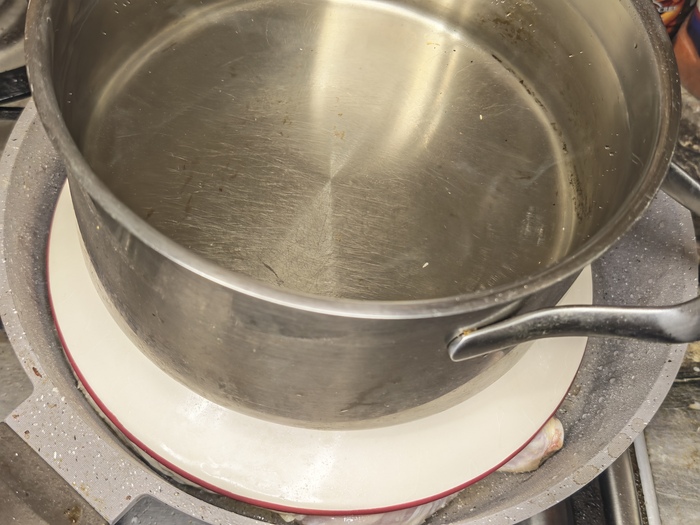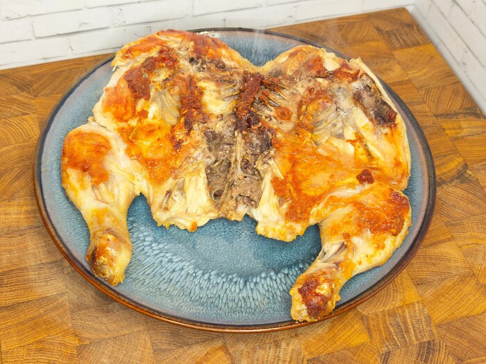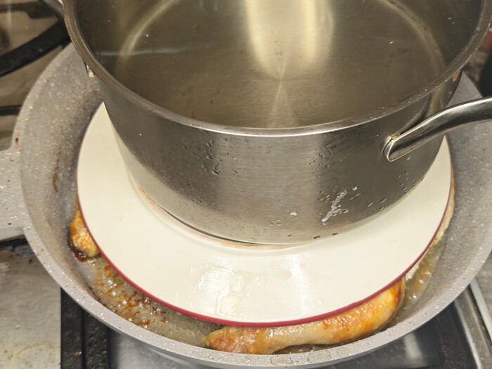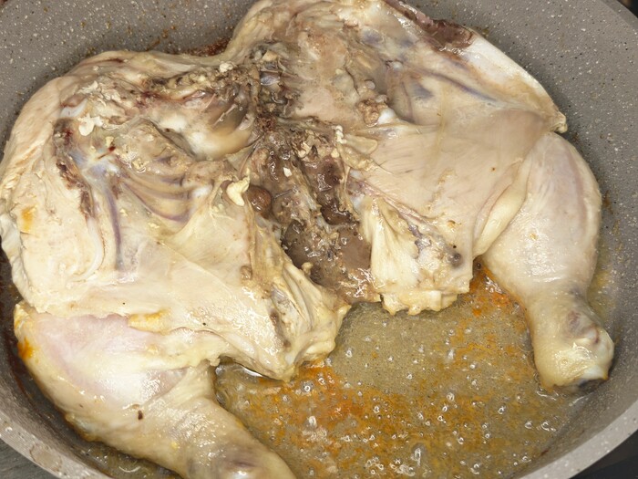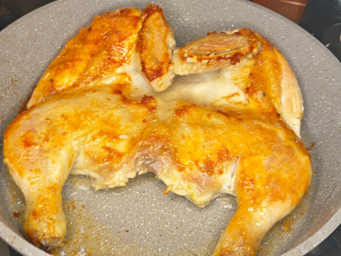 7. Накрываем тушку тарелкой и ставим сверху груз. По сути, мы имитируем приготовление цыпленка тапака. Жарим на средне-сильном огне минут 20. Возможно меньше - зависит от размера птицы.