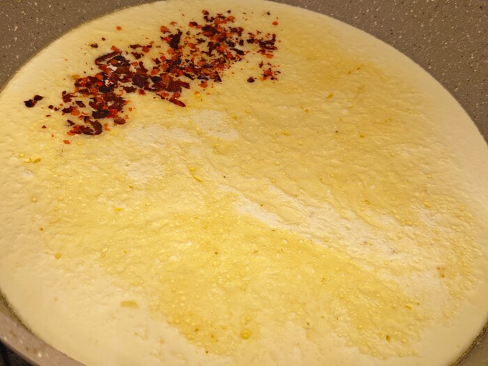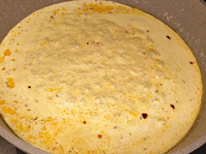 13. Заливаем в сковороду сливки, делаем огонь минимальным. Прям совсем минимальным - на сильном огне сливки могут свернуться и рассориться, соус, соответственно, не получится.