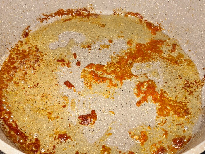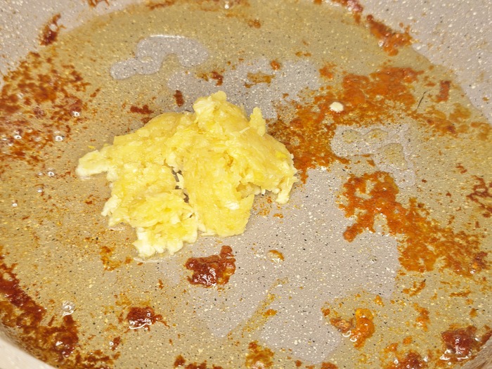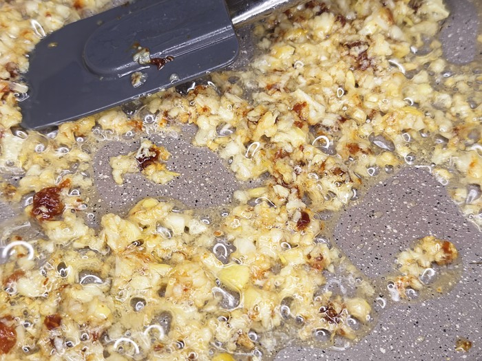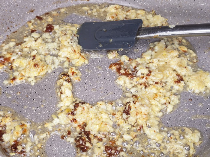 12. Сразу, как убрали курицу, выкладываем на её место чеснок. Он тоже какой-то подавленный, да. И секунд тридцать его обжариваем на среднем огне. До совсем лёгкой румяности. Не переживаем - горелый чеснок нам ни к чему.