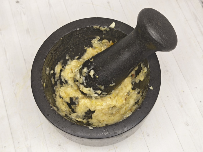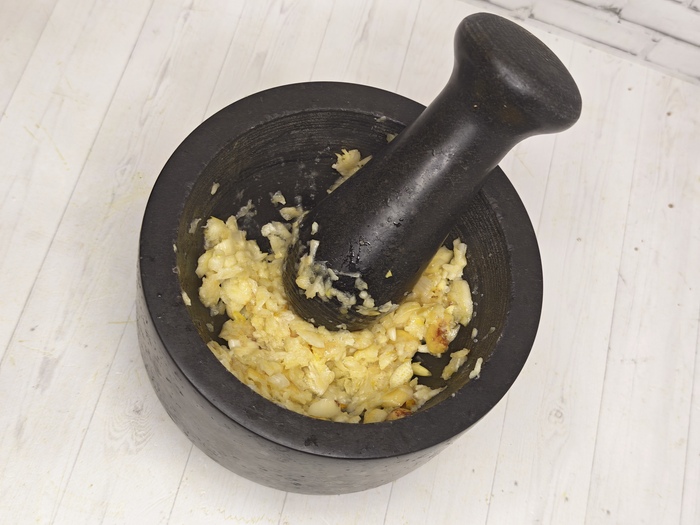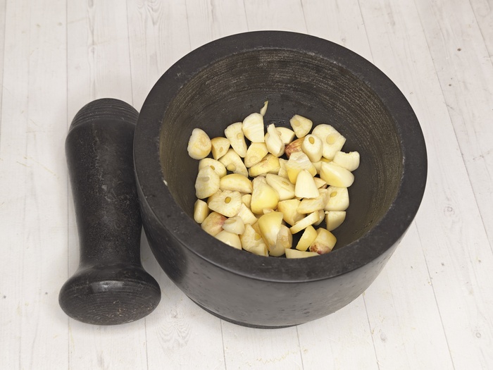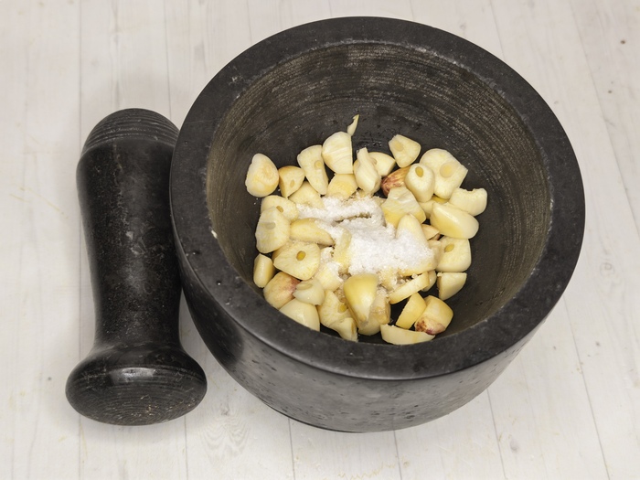8. Чистим чеснок, режем его на небольшие кусочки (так будет проще его измельчать), ссыпаем в ступку вместе с остатками соли и всячески его давим. В кашу. В принципе, можно воспользоваться блендером или давилкой для чеснока, или даже просто ножом, но текстура после ступки лично мне нравится больше всего.