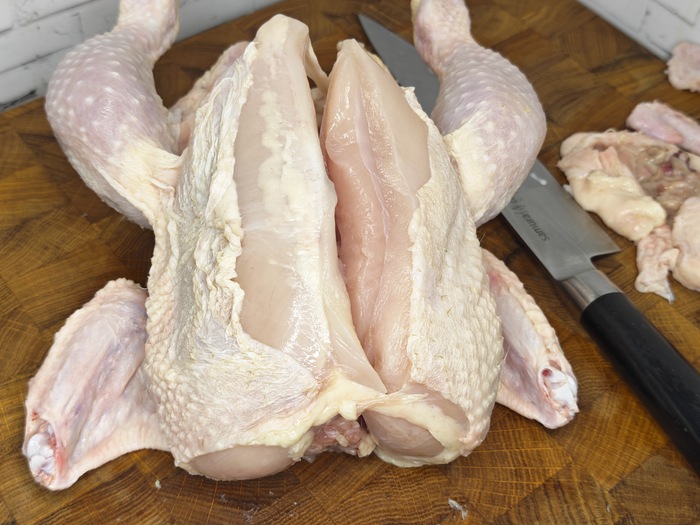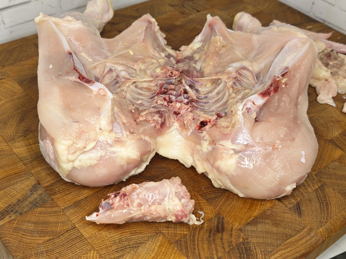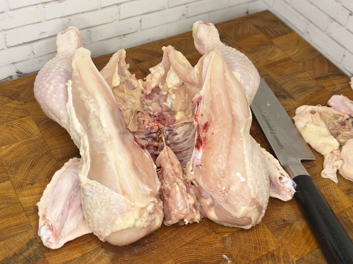 2. Разрежем курью тушку вдоль грудины, заодно уберем шею, если она там есть и финально зачистим внутреннюю часть птицы от остатков печени и прочих внутренностей.