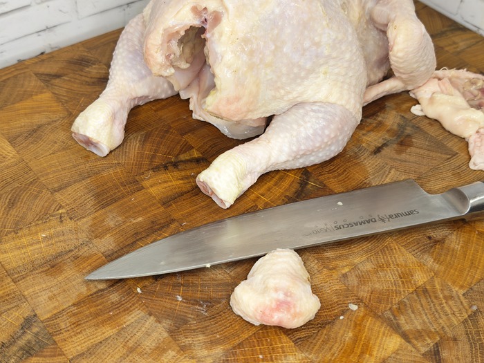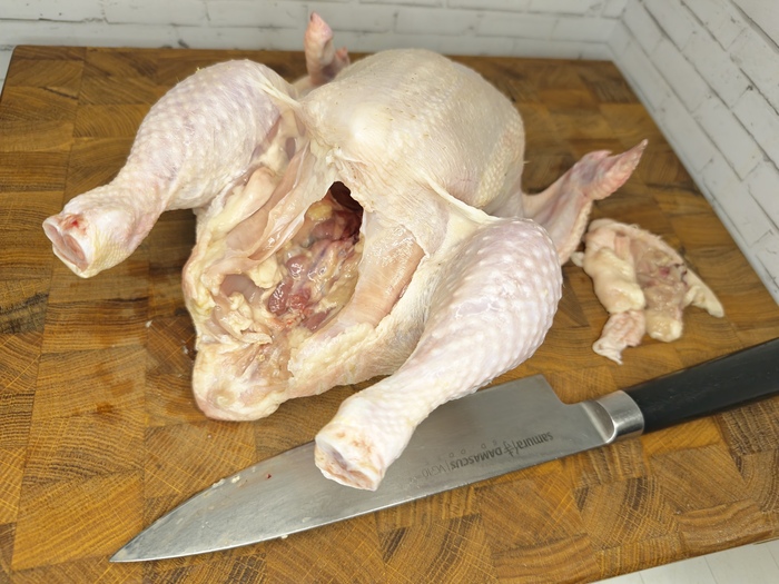 1. Сначала зачистим курицу от остатков перьев, если они есть, неприятных ошмётков кожи с жопки и шеи, уберем "пальцы" с крыльев, отрежем гузку.