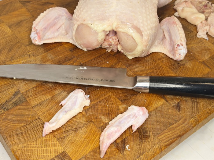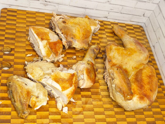 16. Разделываем куриную тушку. На самом деле, можно буквально на четыре куска - крест-накрест. Но я, все же, предпочитаю помельче: крылья, грудку на четыре части, бедра, голени.