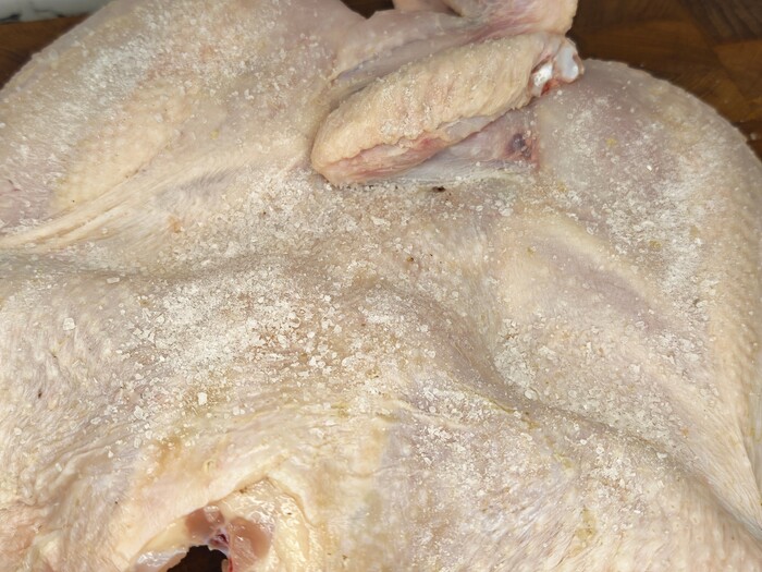 5. Солим тушку где-то половиной имеющейся соли. Со всех сторон.