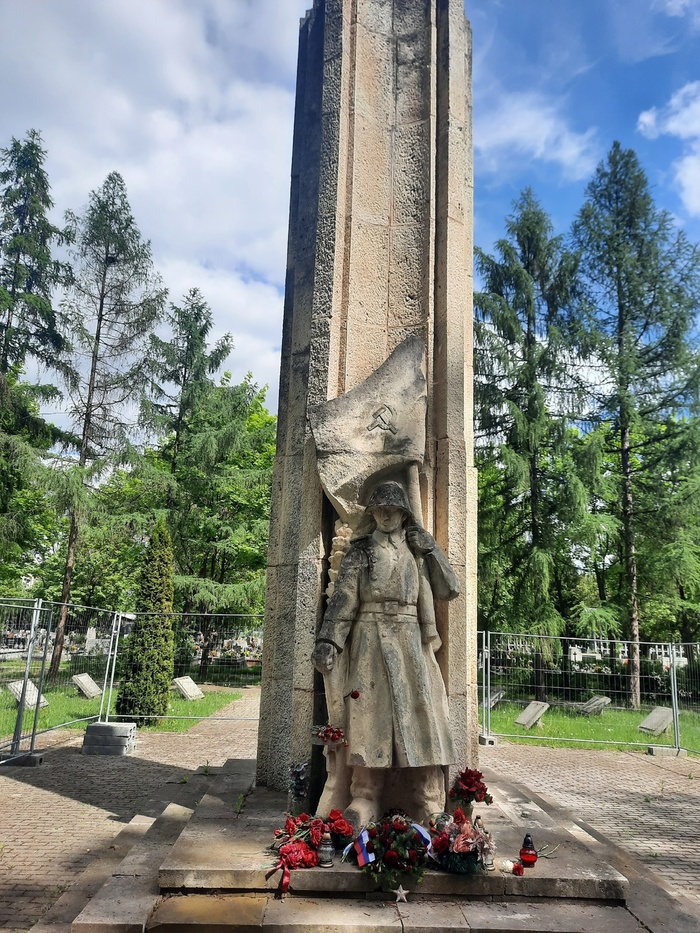 Это захоронение советских солдат, к счастью, недоступно для вандалов, потому что находится на действующем кладбище. К тому же, как видно, не всем полякам по душе борьба с памятью об освободителях этой земли – у мемориала всегда стоят цветы.