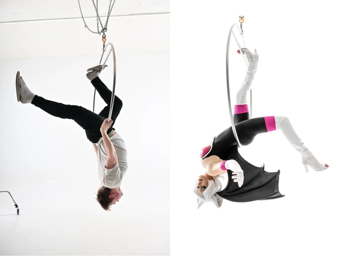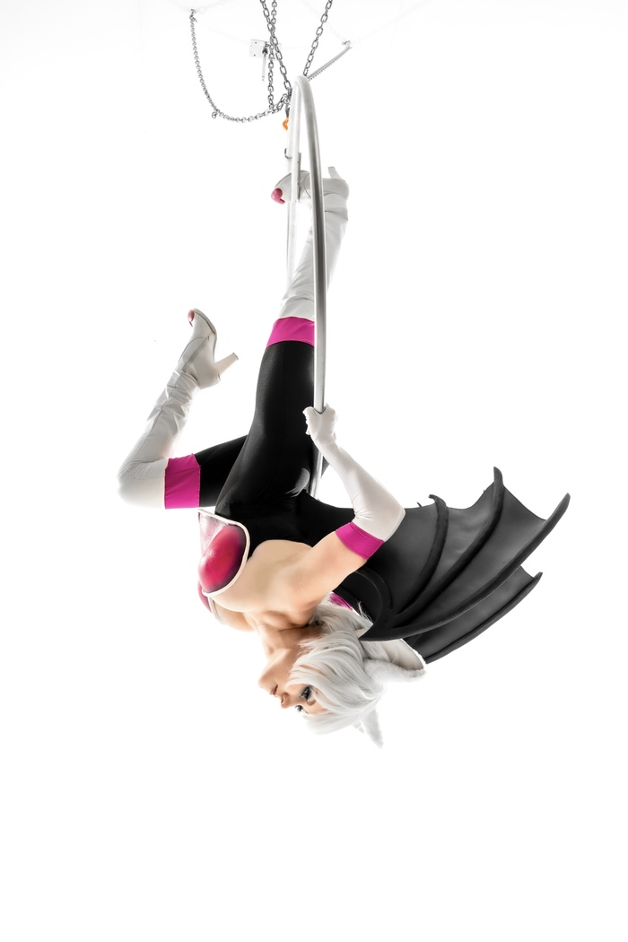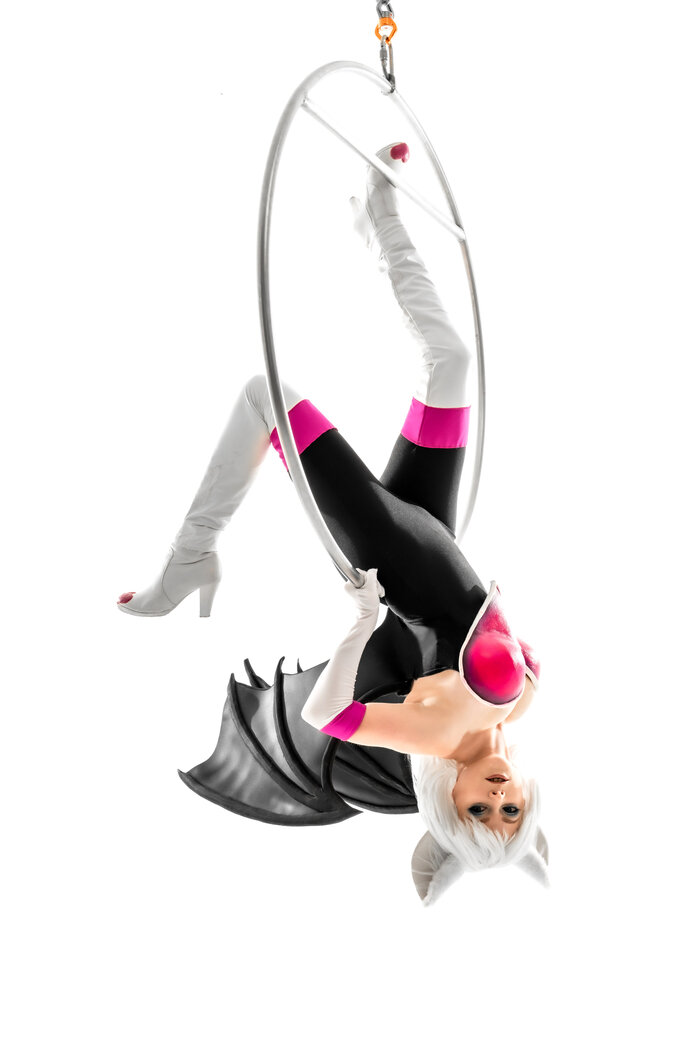 С акробатикой всё тоже весьма непросто – застыть верх ногами в одной позе, перенести весь вес на поясницу, держать равновесие носком сапога. Я рисковала сорваться и полететь вниз на бетонный пол – циклорама не оснащена матами) При этом надо пытаться ещё и отыграть персонажа для красивого кадра… а отыграть трудно, когда ты весь в напряжение. Еще и кольцо постоянно крутится и тебя отворачивает от фотографа)) На утро мышцы отказывались функционировать. Зато какие кадры!