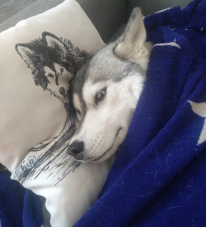 Поверьте, хаски никому ничего не должны - мои вот с большим удовольствием спят на диване. И после долгих выездов на природу, где они носятся по лесу, плавают в речке, ловят лягушек и гоняют птиц и прочую дичь, по возвращении домой с огромным удовольствием снова забираются на диванчик. У Тонкс вот, например, есть любимая подушечка. Цири иногда тоже не прочь полежать под одеялком.