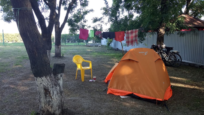 День 106 (Краснодарский край). Накануне устроили посиделки в беседке на территории кемпинга. Народу мало, те кто есть, залегли спать. За забором музыкальная программа местного ресторана. Довольно приятно пела некая дама, жалко её не было видно. Оказывается, выпив коньячку, очень приятно покачаться в гамаке, гладя на звёзды. Сегодня точно рано никто никуда не поедет, тем более не написаны отчëты за три последних дня.