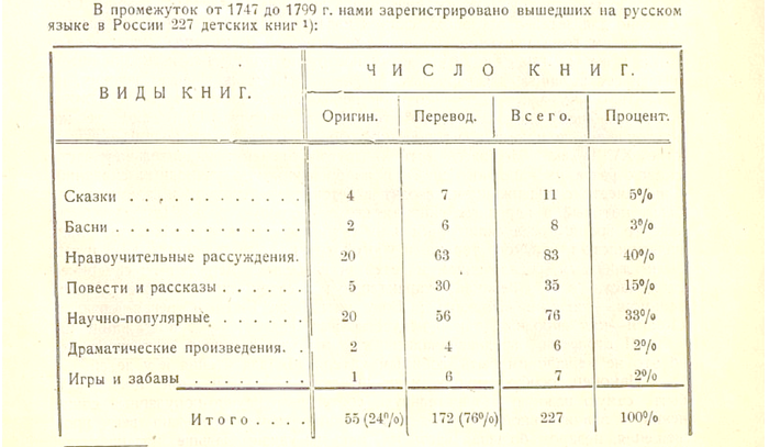 Целых две небылицы! Много это или мало? Статистика 1747 - 1799 годов утверждает, что 50%. Не верите – посмотрите сами. В общей сложности за пятьдесят лет было издано 4 оригинальные русские сказки, по 20 нравоучительных рассуждений и научно-популярных сборников .