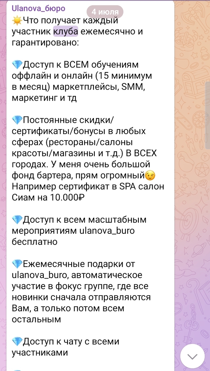 Таким образом ослепила эта тема более 170 девушек, которые отдали 15/60/90к в зависимости от срока, на который в него заходили. И вот 15 июля эта машина начинает крутиться: девочки общаются в чате, строят планы, Уланова Екатерина с завидным постоянством пишет о планируемых событиях, составлет целые расписания, по которым уже через месяц можно было бы стать экспертом во всем.