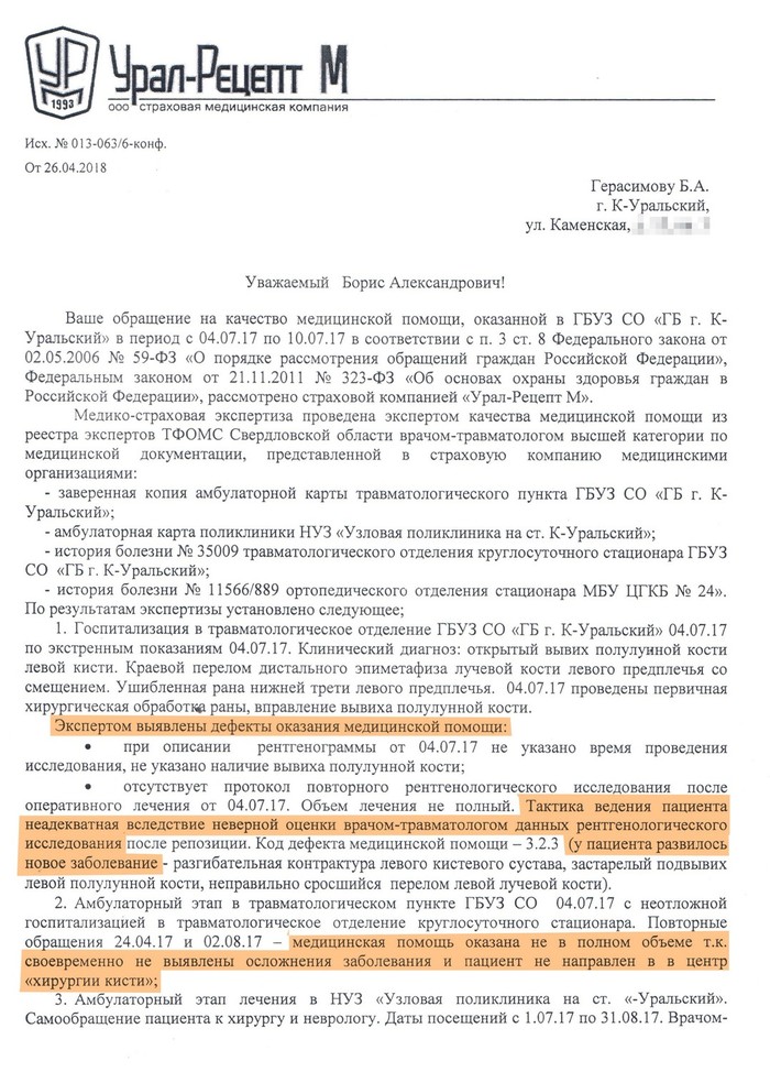 В Екатеринбурге после обследования выяснилось, что Борису «забыли» вправить вывих и неправильно зафиксировали перелом кости. Фиксация спиц была такая, что препятствовала устранению этого вывиха.