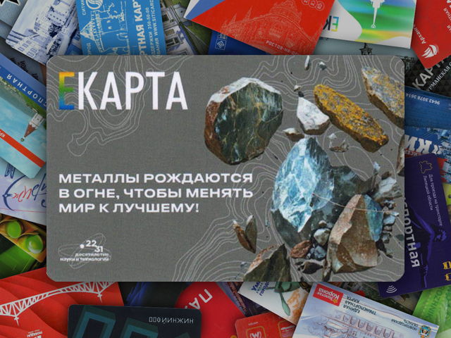 Транспортная карта "Екарта", которая выбрала визуальным символом индустриального наследия Урала кристаллы и минералы, что аллегорически отражает богатые природные ресурсы региона. Эти ресурсы играют ключевую роль в становлении Урала как одного из ведущих промышленных и технологических центров Российской Федерации.