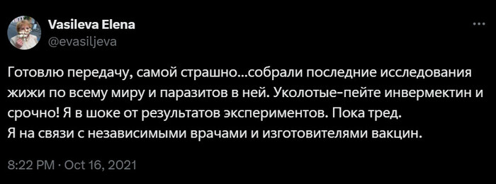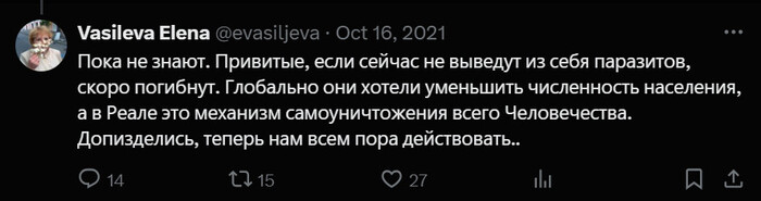 Я перешел в Твиттер этой Васильевой, а там есть ссылка на сайт. Так вот на сайте первая статья. Тут в куче всё: вирусы, паразиты, Илон Маск, чипы, суперкомпьютеры. Я много жести читал по теме вакцинации, но это безусловный шедевр. Мне даже не лень её сюда перепостить. Можно конечно и поржать, если бы не было так грустно. Ведь у этой больной на голову бабы есть последователи. Которые весь этот бред обсуждают на серьезных щщах. Сайт у неё на домене ru, поэтому я уже отправил жалобу в РКН. Вроде как у нас пропаганда антивакцинации запрещена. Итак, статья(орфография и пунктуация автора. Самую жесть я выделил жирным шрифтом):