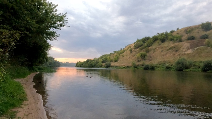 Нашел себе стоянку на окраине города у реки. Уточки плавают - рыбное местечко. Я считаю такие места безопасными для ночлега. Вблизи живут люди, значит дикий зверь сюда не ходит. Гусарам тоже несподручно здесь гулять - вблизи нет магазинов. Рано утром может придут рыбаки.
