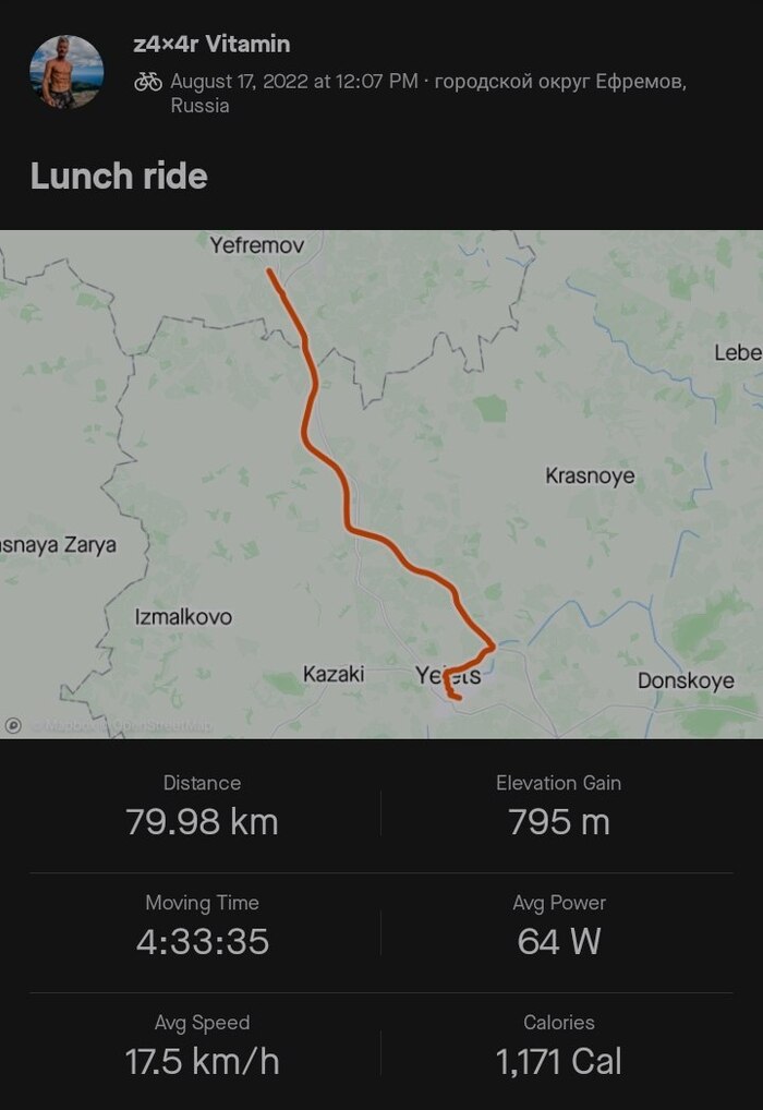 80 километров проехал сегодня. Маловато, ещё и крюк сделал. Зато в кои-то веки спокойно разбил лагерь до захода солнца, а не искал во тьме с фонарём место под палатку как обычно. Побольше посплю и завтра с новыми силами покручу до Воронежа.