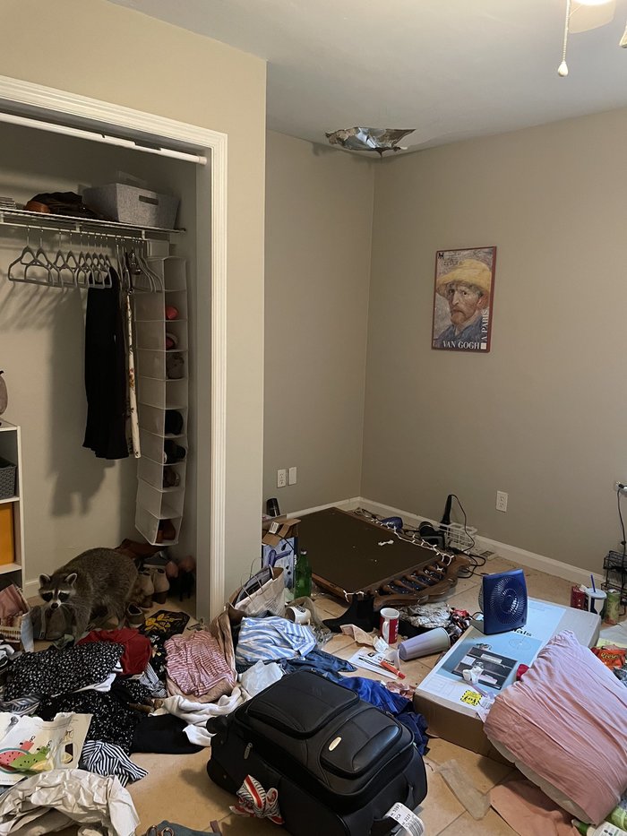 По словам Илифф, 25 июня она приехала домой из другого города и увидела дыру в потолке, через которую в ее спальню провалился енот. Позже с потолка упали еще четыре хищника.