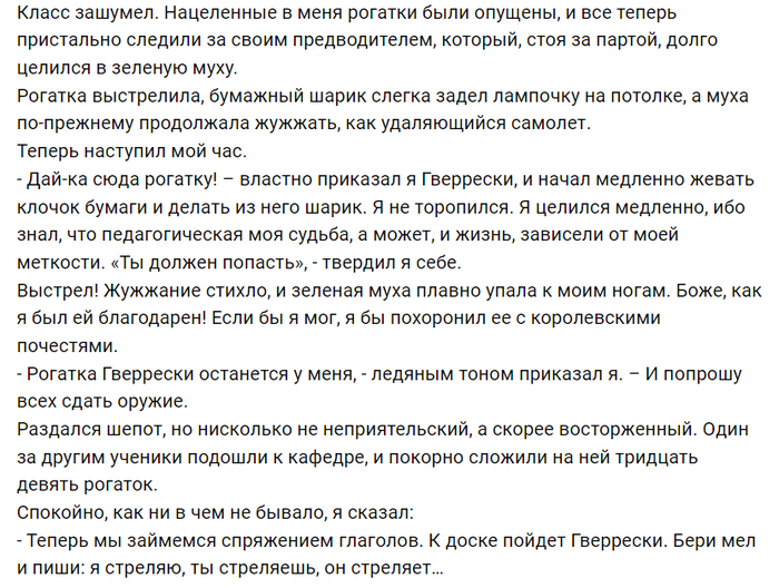 Вся соль рассказа в том, что автор (рассказ ведется от первого лица) сам - вчерашний школьник - по рассказу ему лет 20 - и еще совсем недавно изводил преподавателей точно так же, как и его ученики. Вот почему он так лихо пришлепнул муху из рогатки! Навыки еще не забыл. Хазанову на момент съёмок было 40 лет, то есть он вдвое старше литературного прообраза