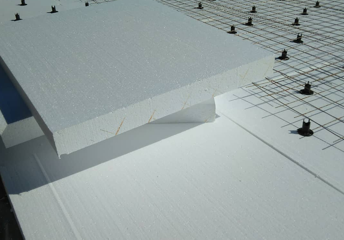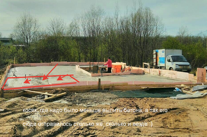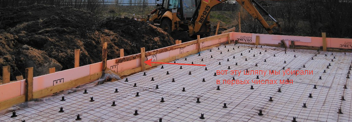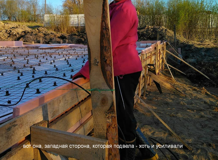 Внешняя опалубка — лучше всего фанера, т. к. с доской можно пролететь. Обязательно укрепление опалубки серьезными распорками — бетон очень легко уходит. Для того, чтобы не уходило бетонное молоко, поверх пенопласта укладывается пленка и заводится на стенки опалубки.