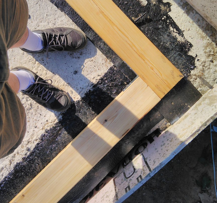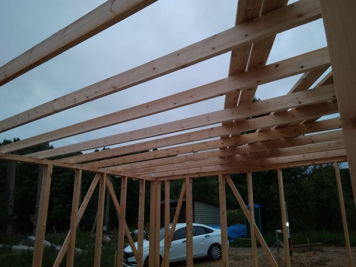 Был произведен расчет на ветровую и снеговую нагрузку, выбран уклон и сам конструктив. В том числе таким образом, что на верх подаются доски, и всё соибирается на самой конструкции - один, Маша лишь подает гвозди и чай :) т.к. если собирать фермы готовые внизу, то их потом в двоем не поднять физически, а денег на манипулятор нет.