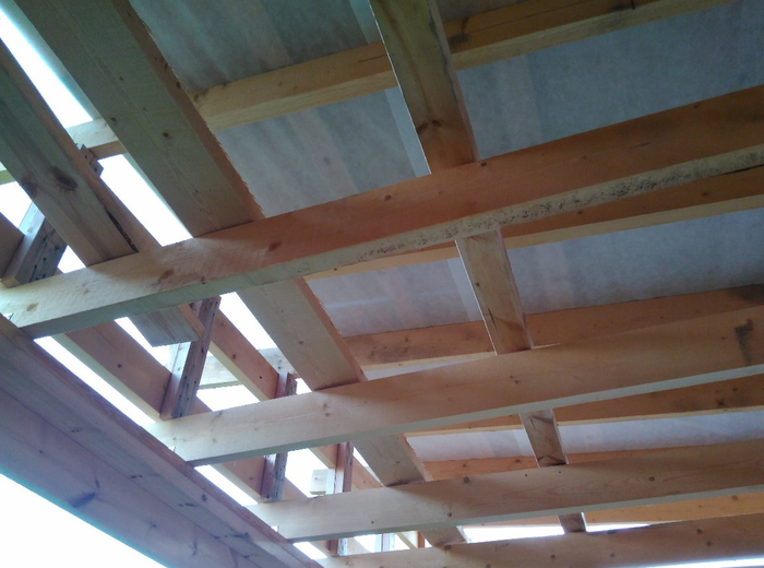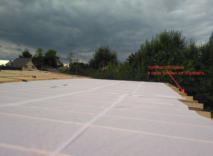 В начале пускаются балки перекрытия потолка. Затем формируются перпендикулярные конструкции опоры под стропила и затем крепятся сами стропила. Поверх пускается мембрана, контробрешетка и сплошная обрешетка. Я пытался экономить и сделал 9мм ОСП. Это на самом деле мало и надо внахлест пустить еще по листу 9мм. Тогда суммарно получится 18мм.Все швы делать с зазором на расширение, а так же промазать их мастикой и проклеить технониколь рубероид, удаляя с него слой прозрачной пленки.