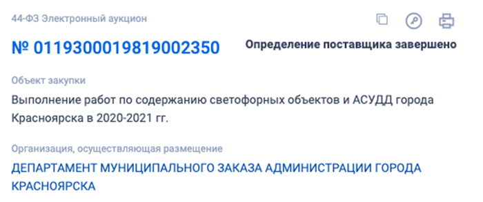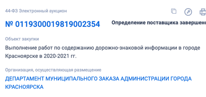 Первый контракт, который мы рассмотрим, – "Содержание дорожно-знаковой информации" в 2020–2021 годах. Выполнение работ оценили в 63 000 000 рублей. "Красдорзнак" без проблем забрал лот и это все заверили официально.