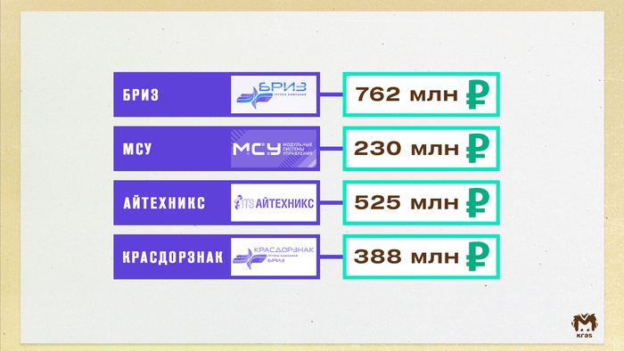 Помимо прочего, было ещё пять похожих контрактов. Всего на сумму больше 700 млн рублей. И это только с 2018 года с УДИБ. Если просмотреть все выигранные аукционы администрации Красноярска за всё время существования "Бриза", то сумма перевалит за 2 (!) миллиарда. А ведь "Бриз" работает не только в Красноярске, а по всему краю. Значит, и объёмы "освоенных" денег в разы больше.