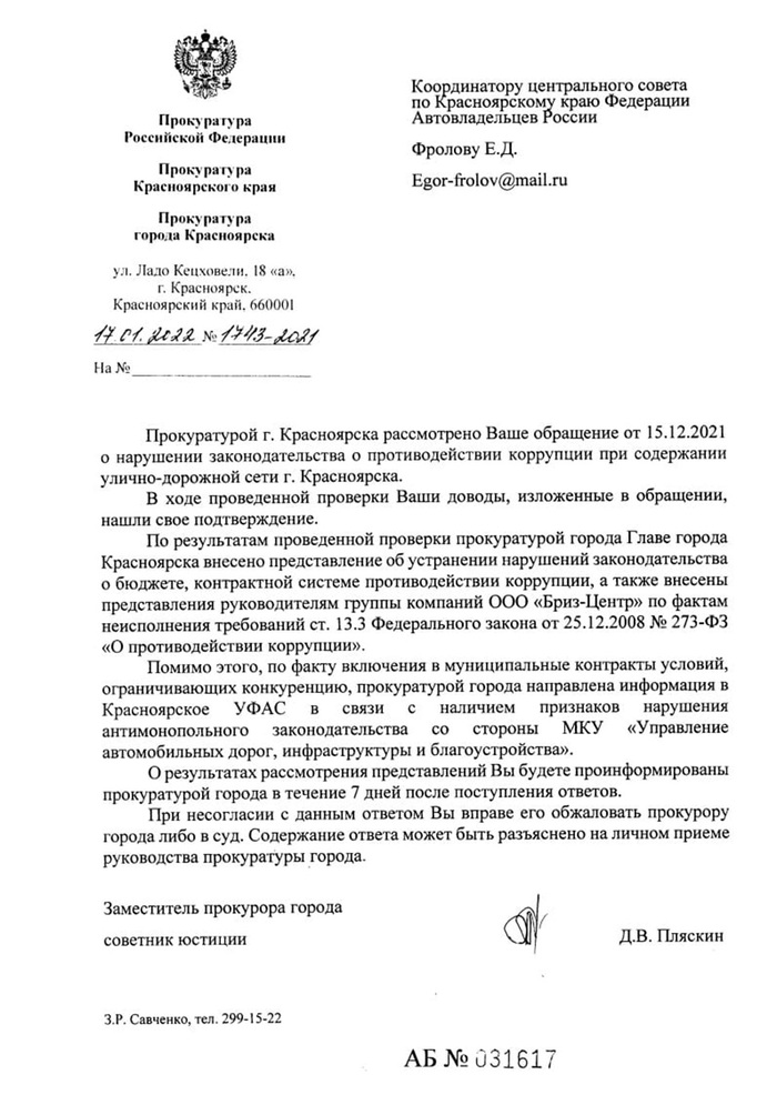 Когда вскрылся один из многочисленных обманов в торгах, прокуратура выписала мэру представление о недопустимости нарушения антикоррупционного законодательства.
