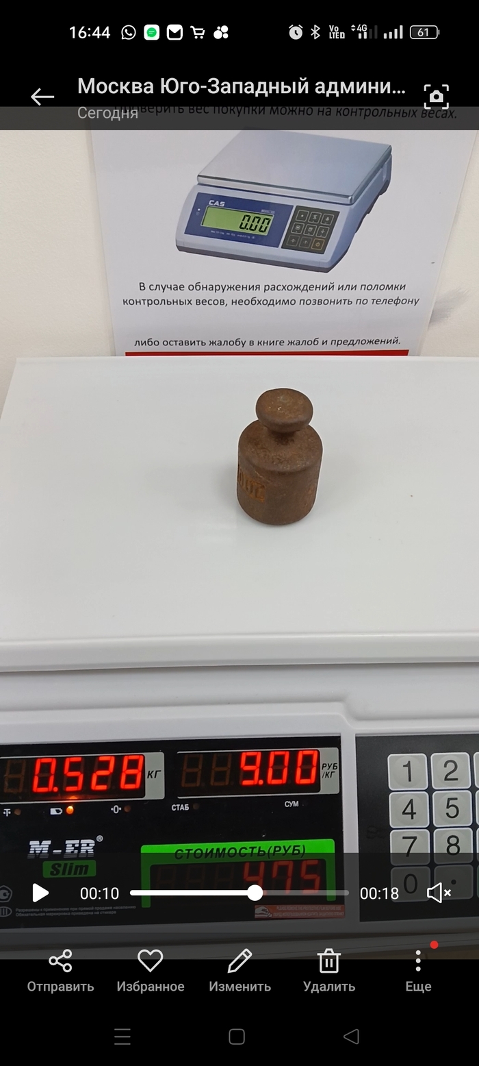 К фото. Одна и таже гирька на весах в Пятерочке, дома и на контрольных весах в Ермолино. Делал тогда специально видео, дабы не придрались к обману.