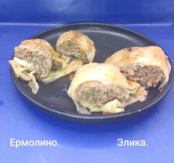 У Ермолино чебурек был уже готовым, осталось только разогреть, а у Элики продукт был сырой и замороженный, за счет этого, тесто у Элики вышло более хрустящим, а вот в начинке переборщили со специями, у Ермолино фарш вкуснее, без лишних добавок. В принципе, оба продукта нормальные, нет сильного перекоса в чью-то сторону.