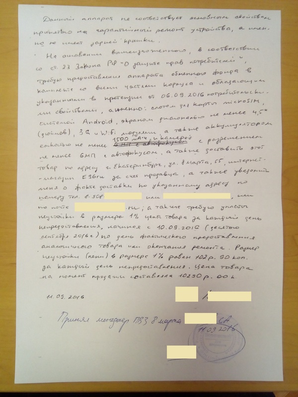 Если надо, я в комментах могу потом это переписать, но для ЛЛ вкратце: я, такая-то, тогда-то сдала туда-то то-то, получила квитанцию №Х. Сданный аппарат обладал теми-то характеристиками (пишем то, что для нас важно, я указала камеру, разрешение её, емкость аккума, диагональ экрана, Wi-Fi). На основании того-то прошу выдать мне подменный аппарат, обладающий аналогичными хар-ками (тут для верности повторила их еще раз), указала на теоретическое наличие пени после 3-х дней невыдачи (т.е. с субботы).