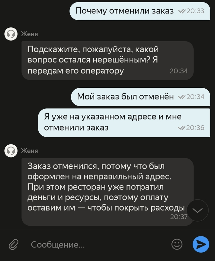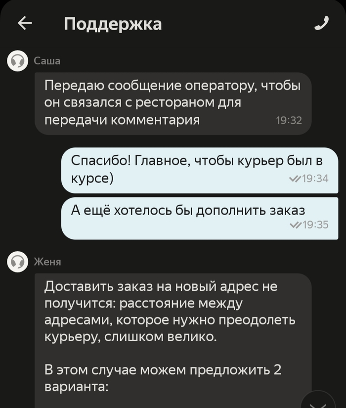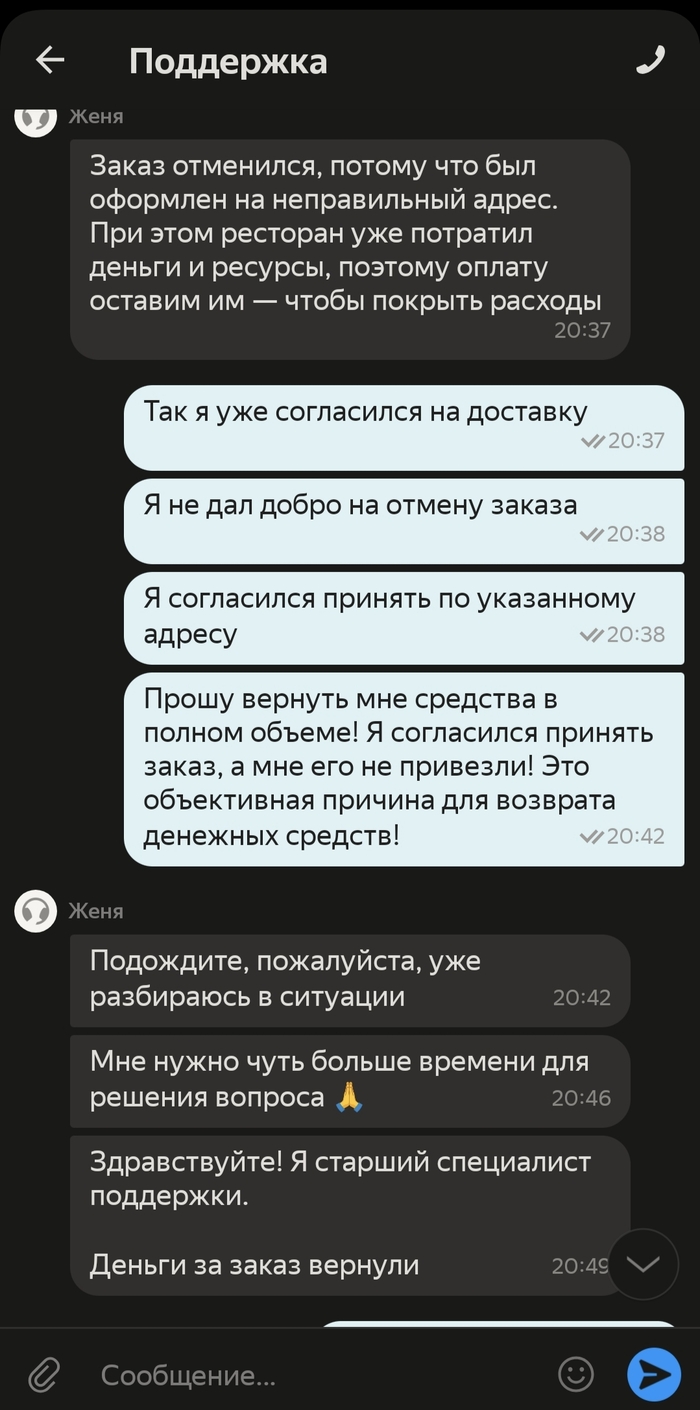 Примерно в этот момент был назначен курьер и я с ним созвонился. Текстового содержания разговора нет, но, если кратко, то он не вошёл в положение, сказал общаться с поддержкой и бросил трубку.