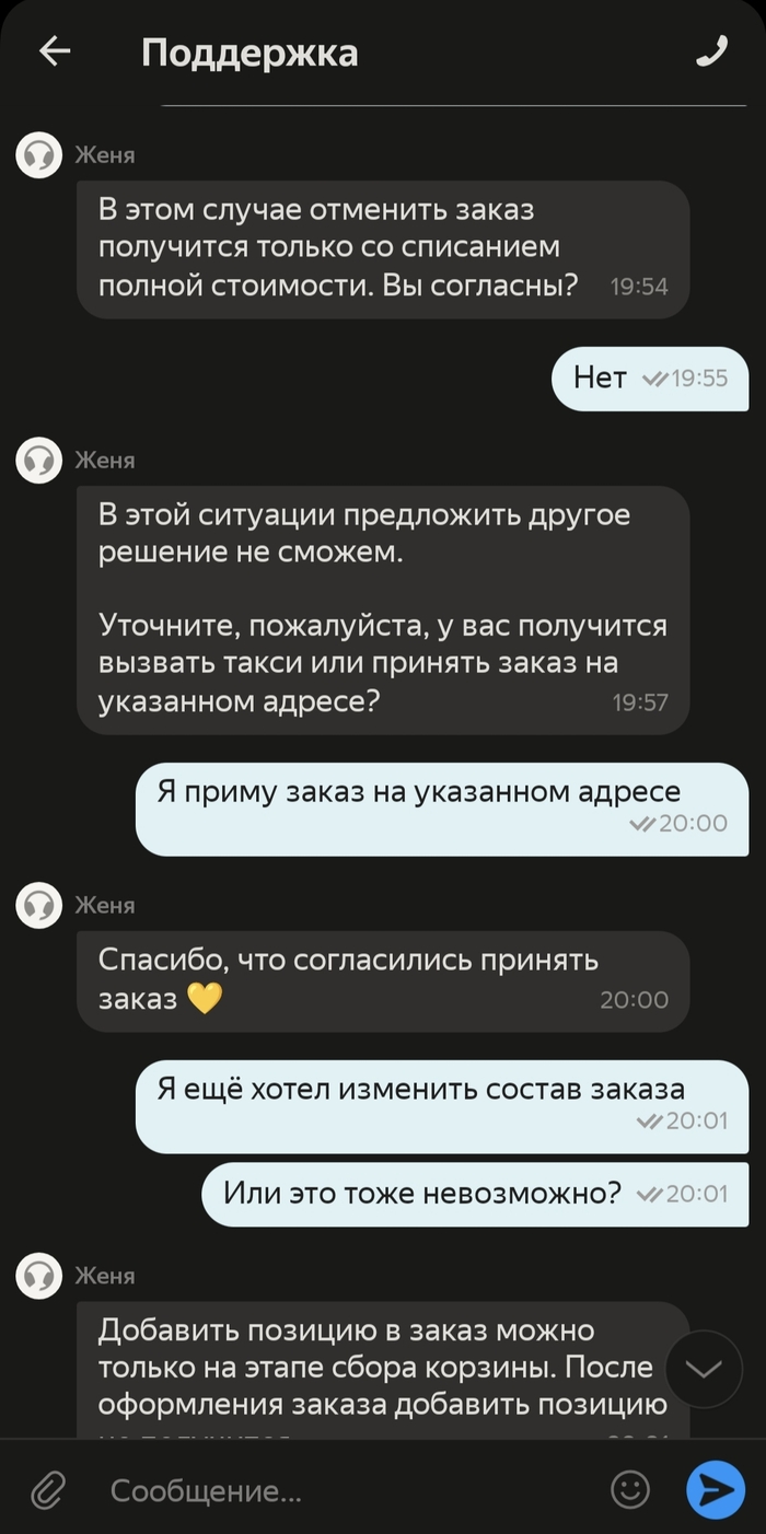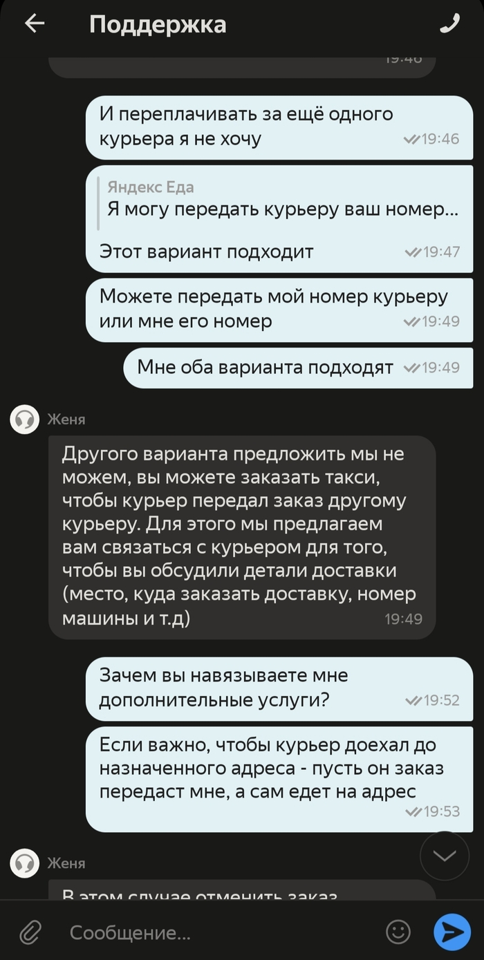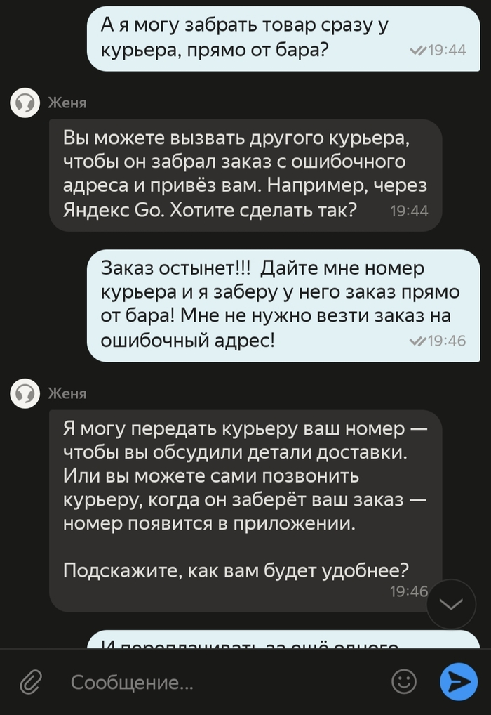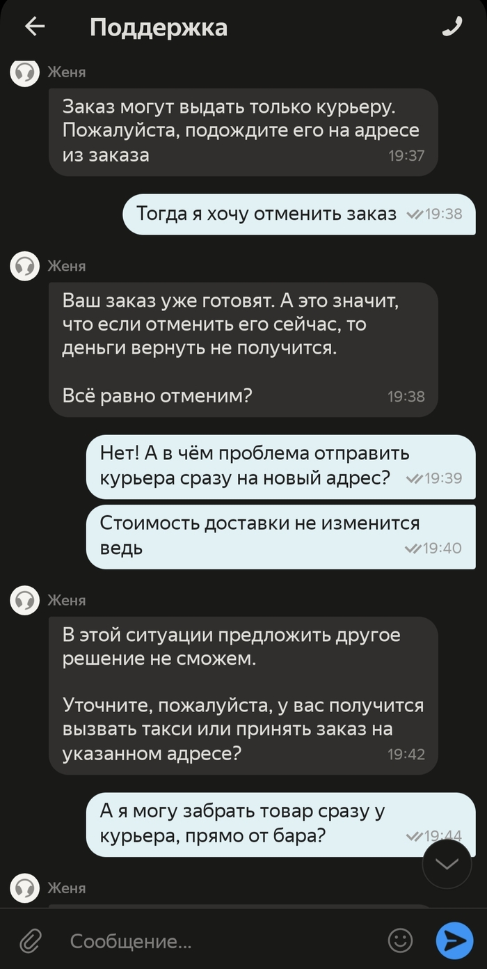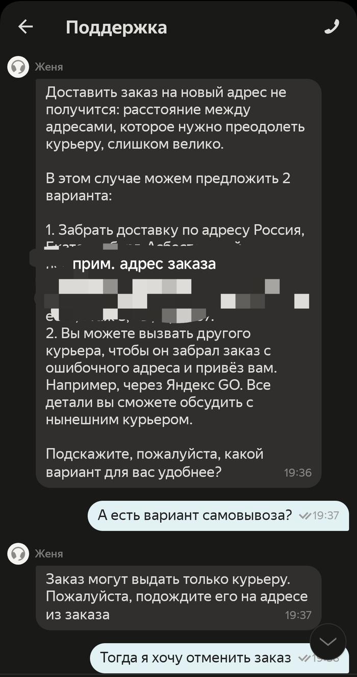 3. Если тут есть представители Яндекса, нельзя ли сделать политику заказов более гибкой? Не было бы этого поста, если бы можно было просто направить курьера на другой адрес или изменить доставку на самовывоз... С учётом изменения адреса доставки можно изменить и цену доставки, я бы доплатил без проблем, а в случае самовывоза, оплатил работу "уже назначенного" курьера. Но зачем усложнять жизнь курьерам и конечному потребителю???