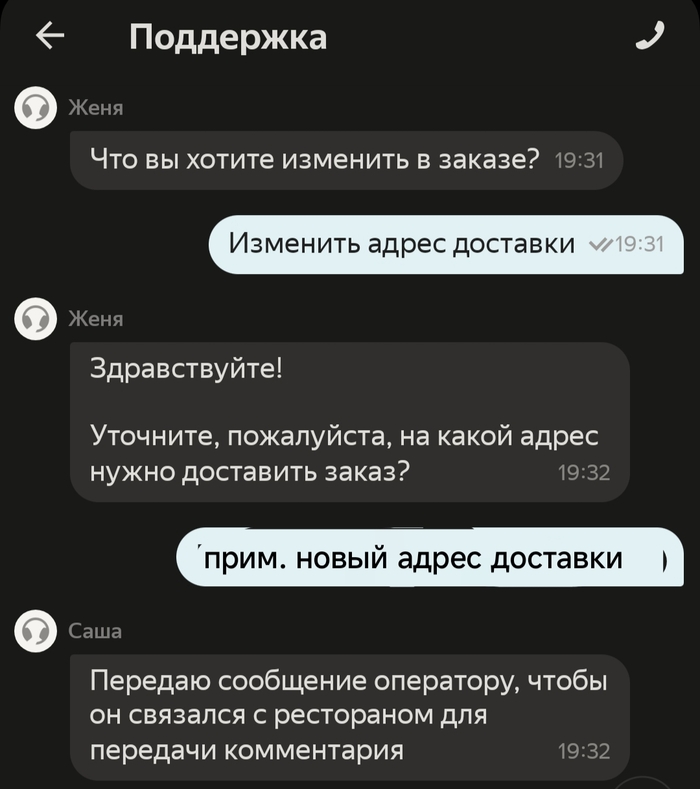 С момента запроса на перенос адреса доставки прошло 4 минуты... Курьер ещё даже не был назначен! Впрочем, смотрим далее...