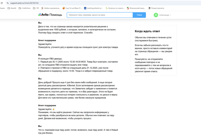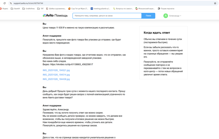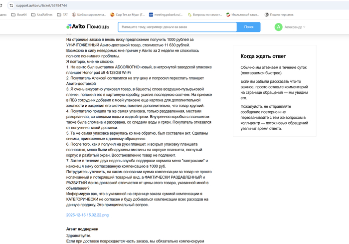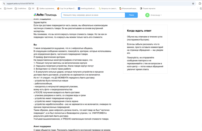 Ниже я приведу полный текст переписки со службой поддержки, чтобы любой читатель мог оценить глубину наших глубин. Рекомендую ознакомиться. В течение 16(шестнадцати) дней я переписывался с Авито Помощь. Я, честно скажу, охреневал все больше с каждым новым ответом от т.н. Агента поддержки. В первый день мне предложили щедрую компенсацию в 1(одну) тысячу рублей. Далее были отписки, уточняющие вопросы, повторные запросы фотографий, снова отписки и в конце концов - компенсация! Угадайте какая? ВЫ ЗНАЛИ!