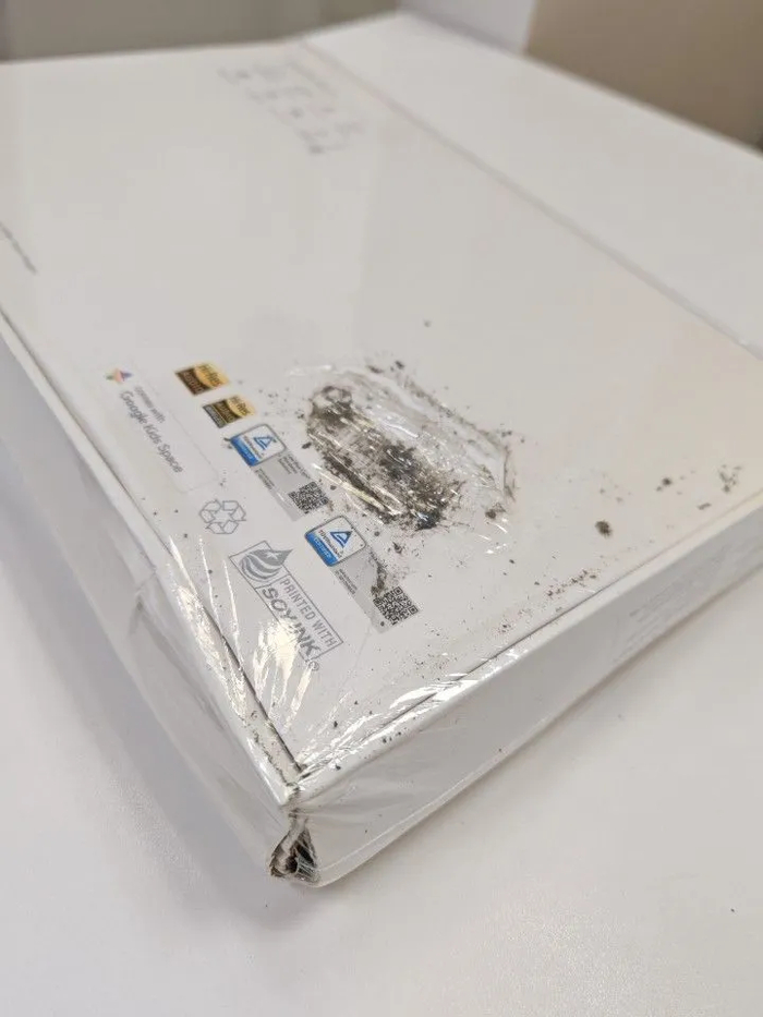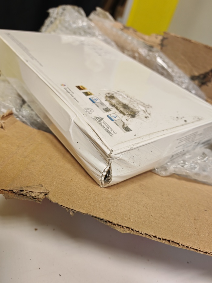 На фото видны следы мощных ударов, еще остатки грязи и воды, как на внешней упаковке, так и на самой коробке с планшетом. Покупатель закономерно отказывается это даже трогать и товар, вернее его останки возвращается ко мне. На этом этапе еще была надежда, что может быть хотя бы девайс цел. Спойлер - НЕТ.