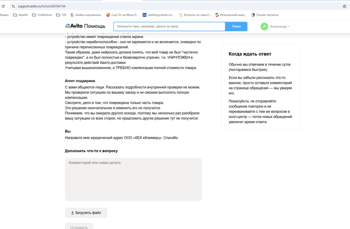 Обращение в поддержку было создано. До этого момента мне казалось, что я что-то понимаю, и вскоре проблема будет решена, ну просто потому что не может же Авито-доставка заниматься порчей чужого имущества (статья УК есть такая). Была у меня некоторая уверенность, что мне принесут извинения, компенсируют стоимость утраты и мы разойдемся, пусть и не довольные друг другом, но хотя бы при своих. О, как я ошибался!