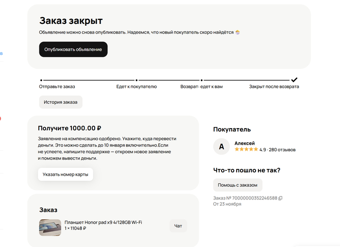 Коротко суть проблемы. Был у меня планшет. Хороший планшет, Honor Pad, новый, в заводской нетронутой упаковке. И решил я его продать хорошим людям, т.к. сам пользуюсь другим и он меня устраивает. Чего технике зря лежать? Да и денежка на подарки родным к НГ не помешает. Сказано-сделано, вот он уже на Авито. Как ни крути, Авито сейчас самый крупный и известный сервис по продаже-покупке от человека к человеку. Нашелся покупатель, который попросил отправить его Авито-доставкой. Договорились на 11 630 ₽. Авито-доставка является платной, т.е. покупатель оплатить 11630, а я получу меньше на комиссию доставки. ОК, нет проблем.