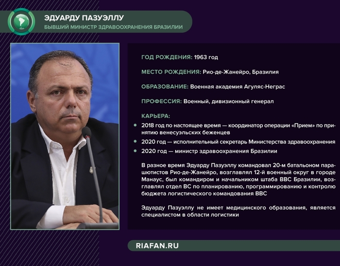 Генерал бразильской армии Эдуарду Пазуэллу покидает пост министра здравоохранения Бразилии через шесть месяцев после присяги. Эти полгода ознаменовались неограниченным вмешательством Болсонару в дела Минздрава, коллапсом системы здравоохранения в Манаусе, а затем и во всей стране, а также рекордными показателями по заражениям и смертности.