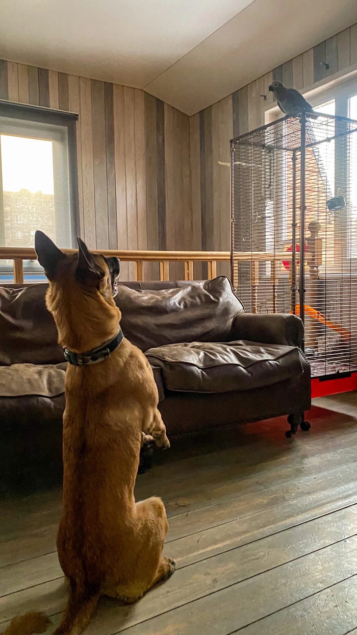 У меня Малинуа ( Верба) и Жако ( Ася), та ещё « весёлая» компашка , я вам скажу)) Ася Вербу вообще не боится, дразнит её даже специально, а Верба носится за ней по дому, схватить норовит. Ася слова-звуки на лету заучивает, сейчас командует Вербой, сядет повыше и орёт, Верба ну ка сид (сидеть) , Верба сядет, ну ка плац ( лежать) та ляжет. Но иногда Вербе удаётся Асю за хвост схватить, когда та слишком низко пролетает))