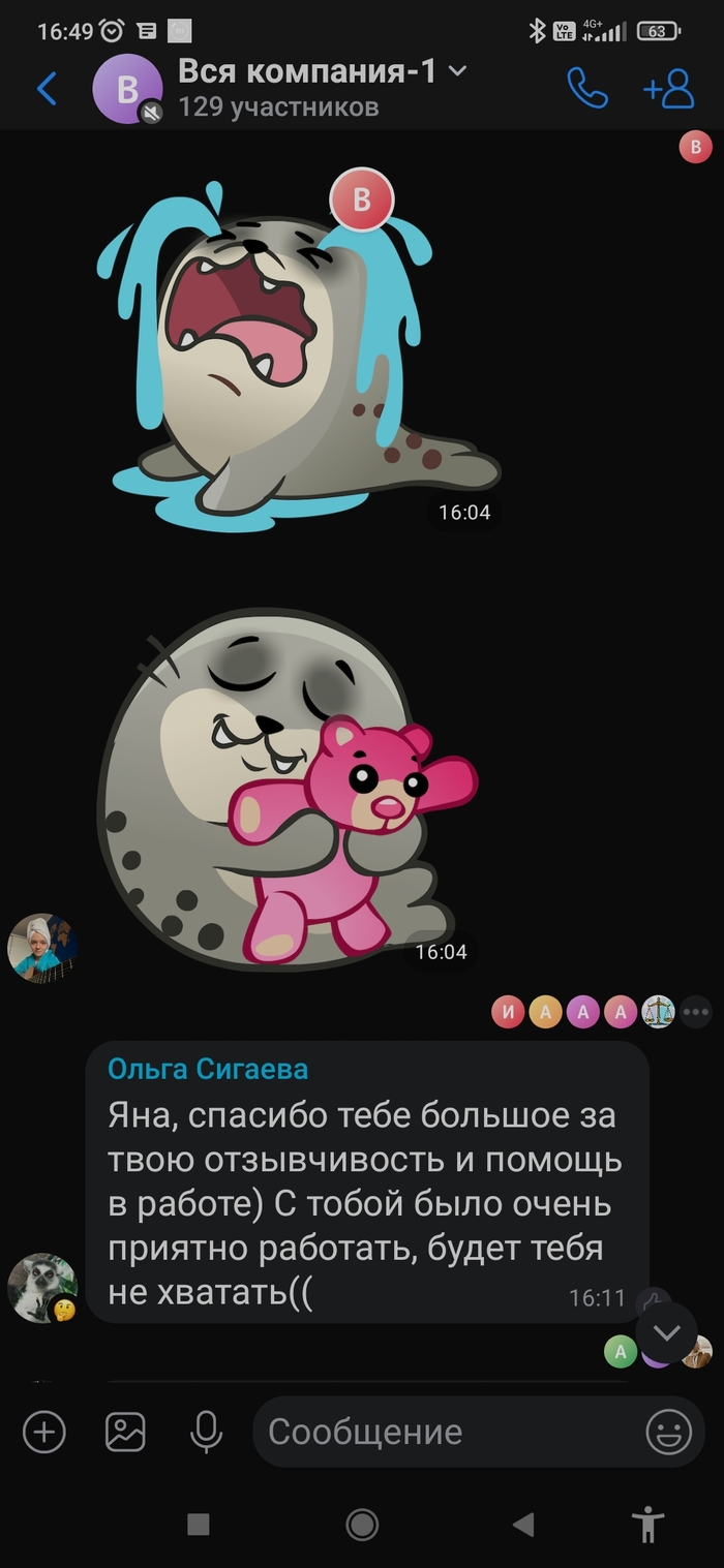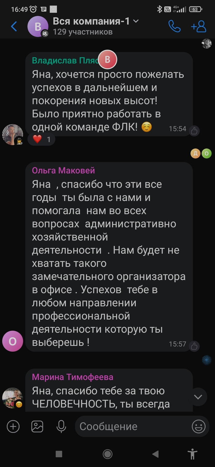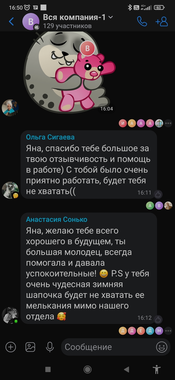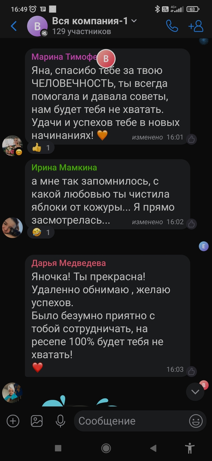 Весь рядовой коллектив провожал практически с соплямии-слезами (пруфы ниже), кто-то писал в личный чат, кто-то в общий, кто-то просто на словах, но ни один кроме непосредственной начальницы не сказал дурного слова про мою работу, прямо как про покойника.