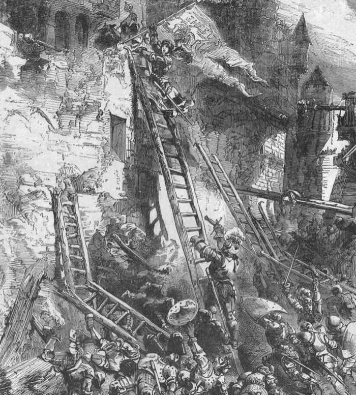 В марте 1429 года Жанна, облаченная в особые полные латные доспехи, верхом на белом коне, с королевским знаменем усыпанным геральдическими лилиями отправилась снимать осаду с Орлеана.