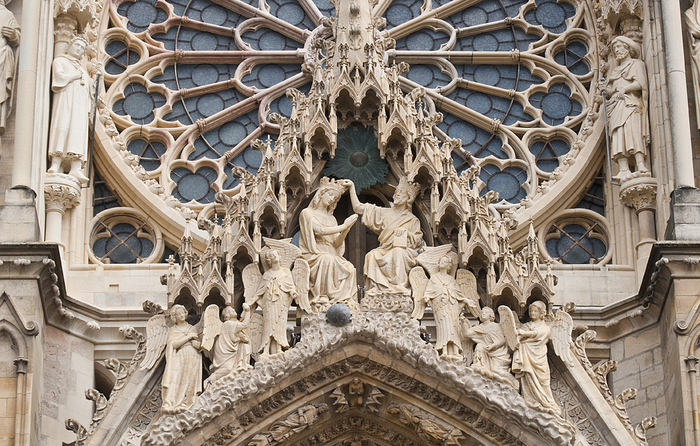 Западный фасад собора построен в стиле зрелой готики. В отличие от Нотр-Дам-де-Пари, башни образуют с фасадом единое целое. Порталы и окна собора украшены вимпергами (каменными ажурными флеронами): их стрельчатые окончания (щипцы) проникают во второй ярус, визуально ломая линию карниза и стирая грани между ярусами. Во втором ярусе высокие стрельчатые окна и ряд колонн и пинаклей наращивают и визуально заостряют вертикальную устремленность фасада.