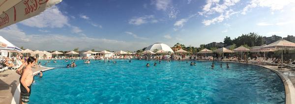 Большой бассейн в принципе ничего. На сайте заявляют что он площадью аж 1000 кв.м. Я перед походом прикинул что это даже меньше, чем олимпийский бассейн. И не прогадал. На глаз бассейн размером метров 25x50 но овальной формы. Глубина везде примерно 1.5м. Для детей есть отдельный бассейн, поменьше, возле горок. Я его не исследовал, ничего про него сказать не могу.