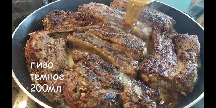 Нарезаем ленту ребер, маринуем их в специях и растительном масле. На разогретую сковороду выкладываем ребра и обжариваем с двух сторон, далее добавляем 200 мл. воды, накрываем крышкой и даем ребрам потушиться 20 минут. Вода должна выпариться за это время, переворачиваем ребра и заливаем 200 мл. темного пива, тушим еще 20 минут. Мясо получается очень нежным, вкус оригинальный и необычный, чем то напоминает мясо на мангале, самое то когда нет возможности выбраться на природу)