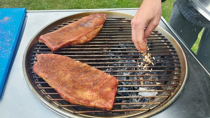 Далее растопили гриль и закинули ребра на решётку. Вместе с этим мы использовали щепу яблони.
