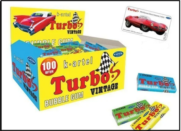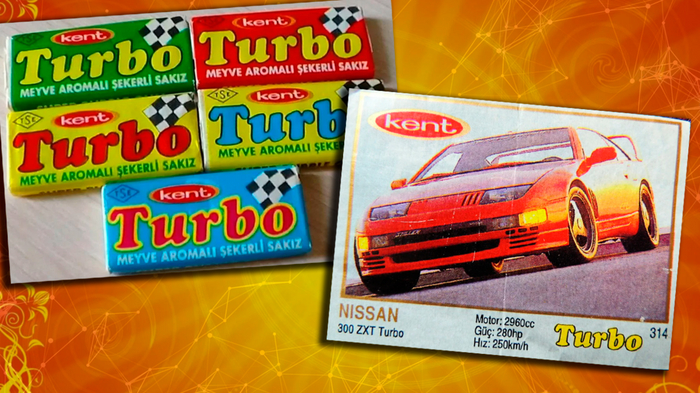 И уже в 1983 году компания "Kent Gida" выпустила первую партию жевательных резинок "Turbo", основной фишкой которых был не только потрясающий персиковый вкус, но и коллекционные вкладыши на автомобильную тематику, которые оборачивали саму жвачку.